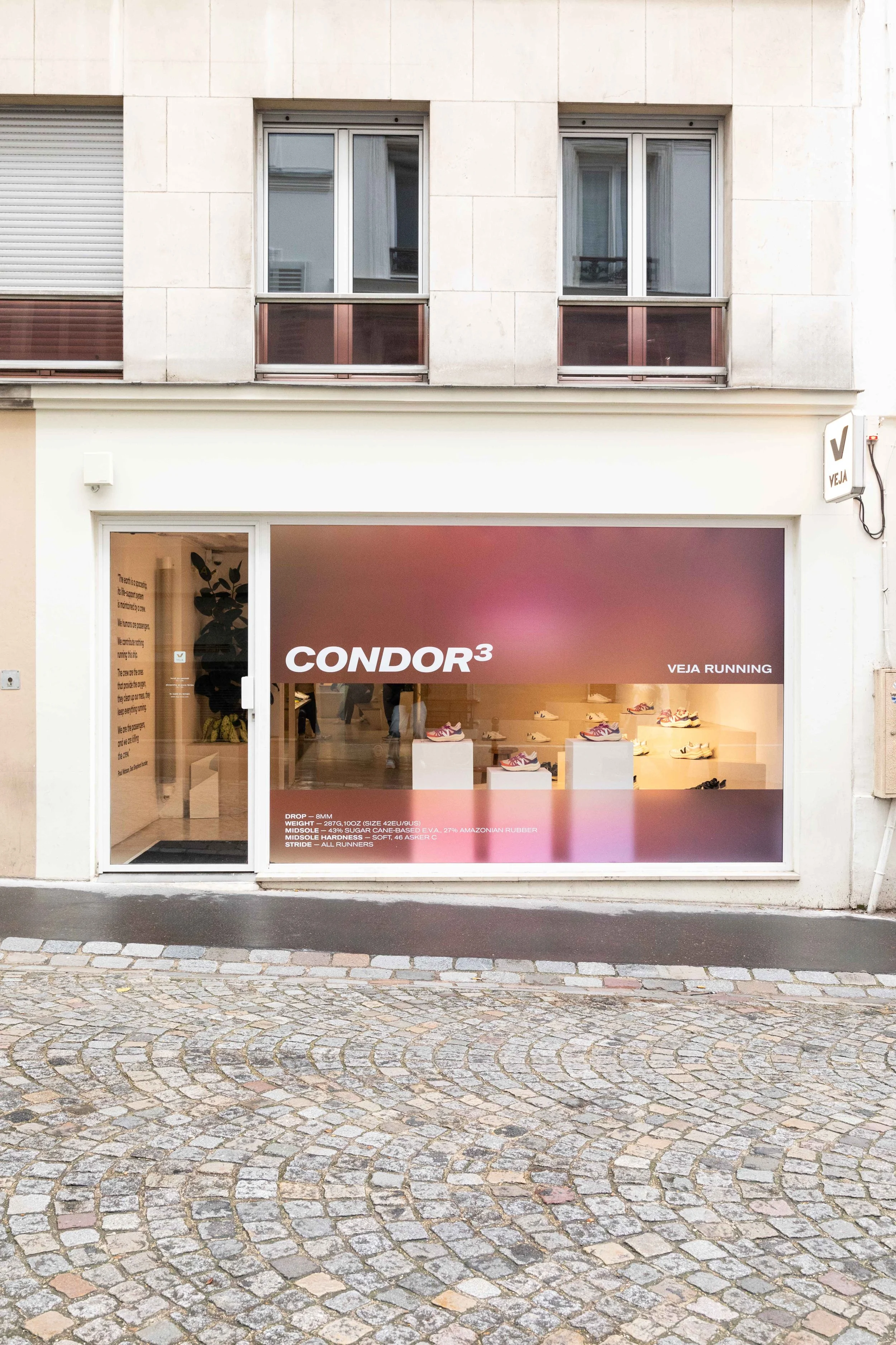 À l'occasion du lancement de la chaussure de running Condor 3, j'ai conçu des stickers pour les vitrines des boutiques VEJA, intégrant le dégradé caractéristique de la chaussure, ainsi qu'un sticker sur le mur du pop-up store VEJA à Darwin.