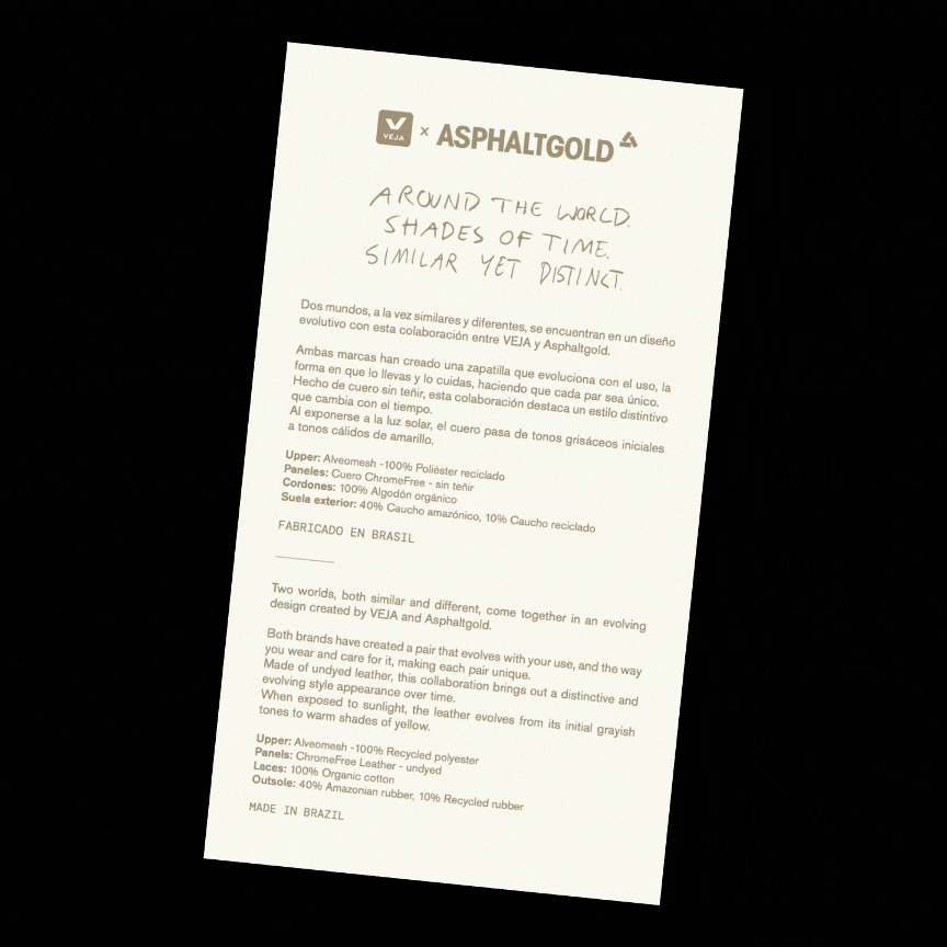 Dans le cadre de la collaboration entre Veja et Asphaltgold, une chaussure qui se décolore au fil du temps sous l’effet du soleil a été créée. Nous avons développé une direction artistique inspirée des couleurs uniques de cette paire.